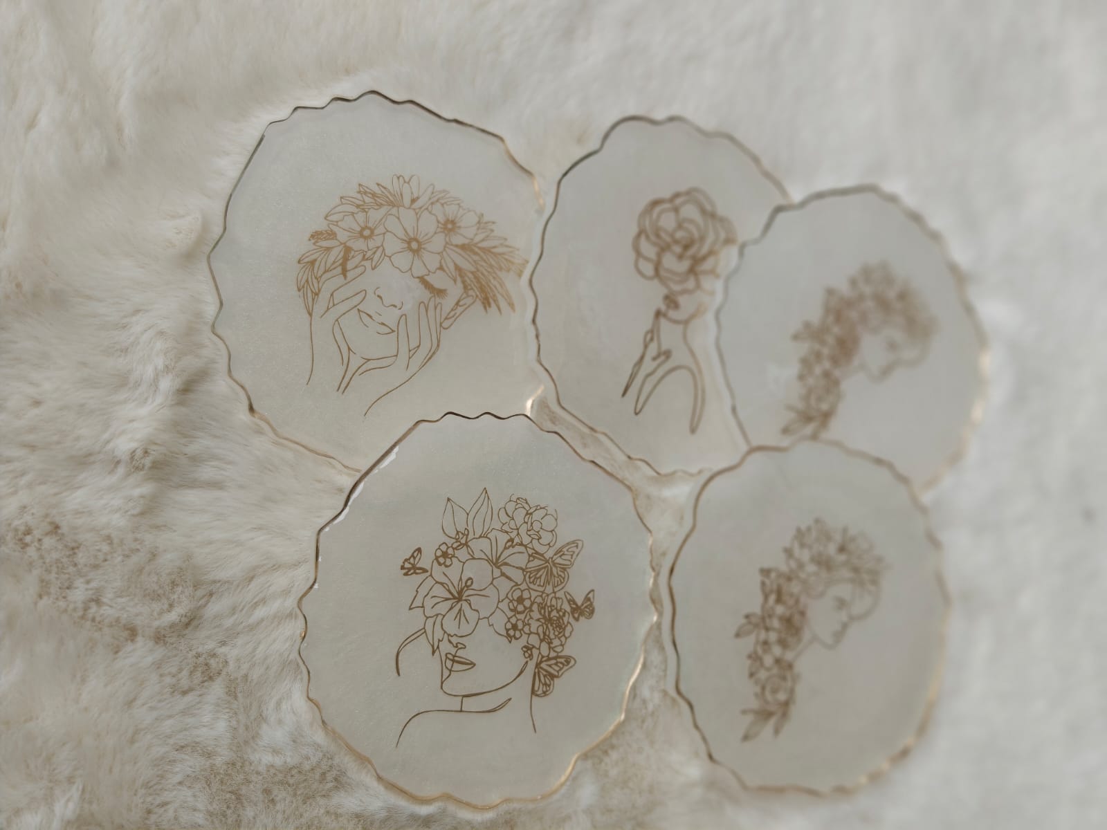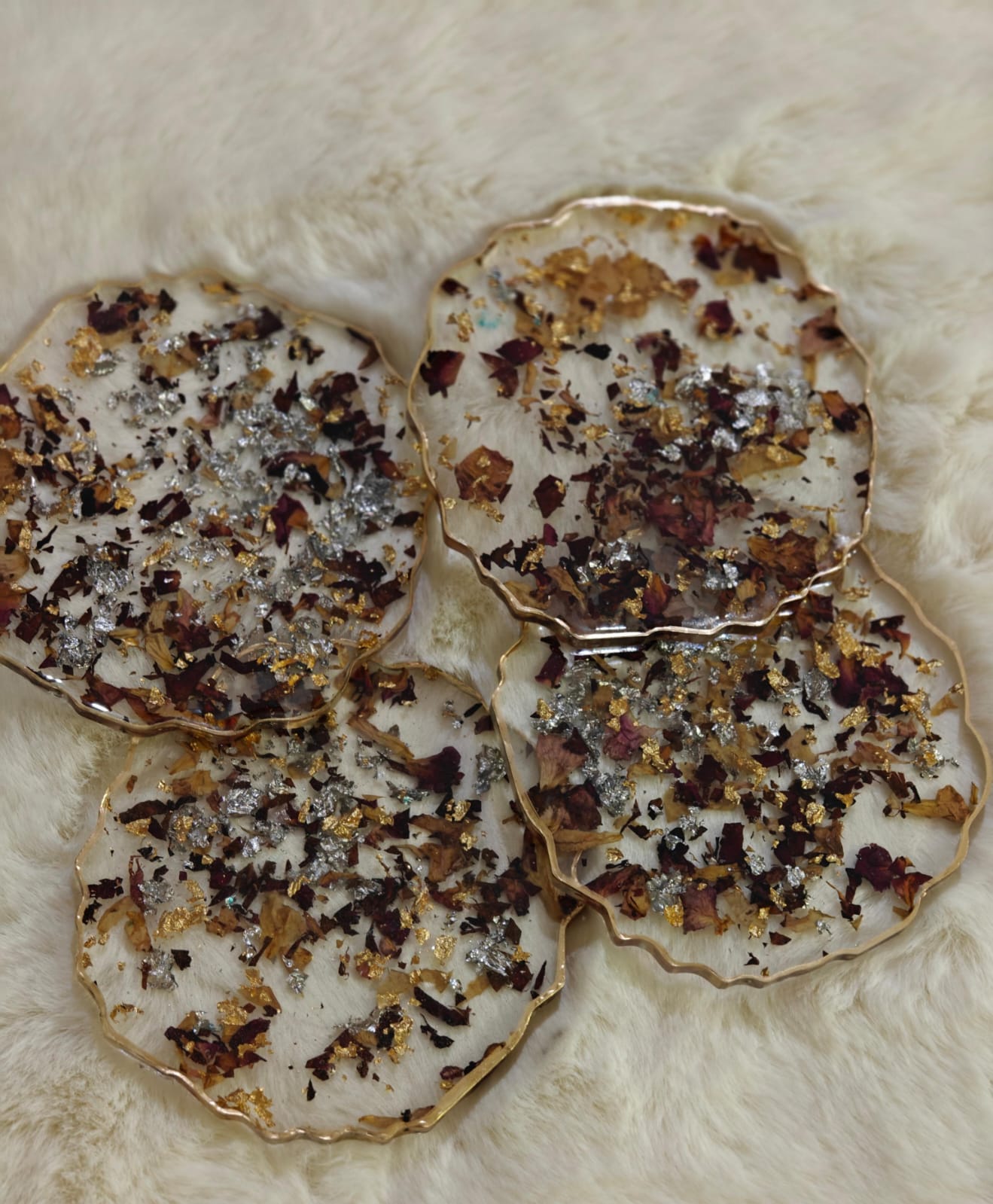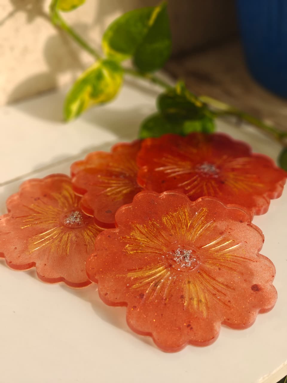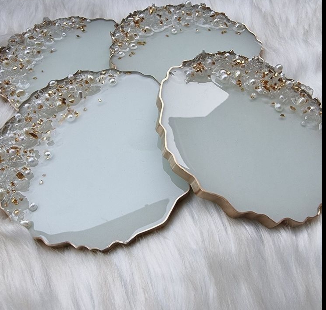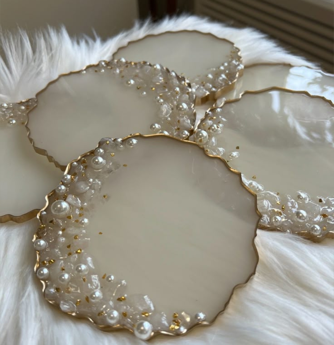 Handcrafted resin coasters with embedded photos, names, flowers, or custom art. Available in sets of 2, 4, or 6. Perfect for housewarming gifts, wedding favours, or your own coffee table.